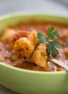 I looked over several "fish stew" recipes and realized that they were all actually very basic. So I went to my kitchen and chopped some onions and garlic and started sauteeing. I added some celery (hey, it looks kinda like fennel), then diced up some carrots and potatoes. This IS a stew after all. Tossed in some seasonings that struck my fancy: oregano, italian seasoning, coriander, salt, pepper, smoked paprika, chopped fresh cilantro. Added a large can of tomatoes, some water, and some clam broth I had frozen that was leftover from a TJ's frozen bag of steamed clams we had awhile back, covered it and went to get on the computer.